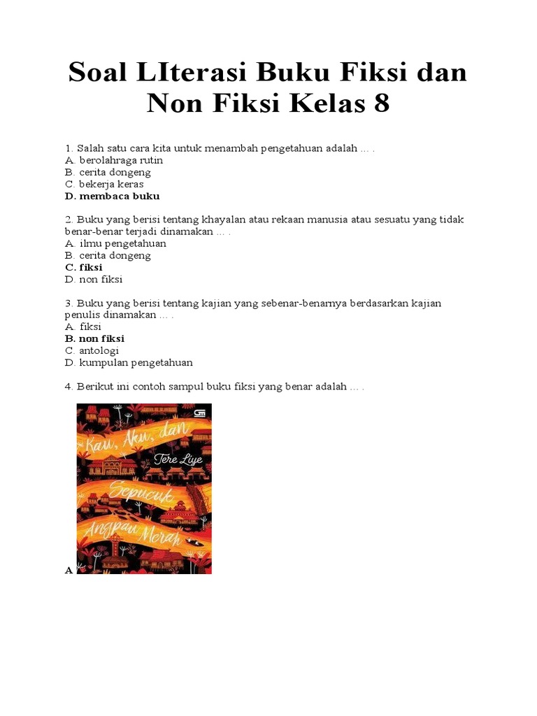Buku fiksi merupakan buku cerita yang bersumber dari imajinasi penulisnya atau buku yang berupa cerita rekaan. Buku non fiksi merupakan berisi informasi yang dibuat berdasarkan data, fakta, dan penelitian. Buku fiksi adalah buku yang berisi cerita atau kejadian yang tidak sebenarnya. Soal literasi buku fiksi dan non fiksi kelas 8. Latihan soal pilihan ganda tentang buku fiksi.